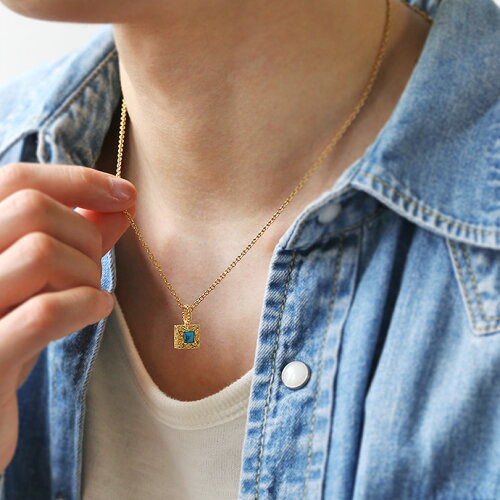 四角型のペンダントの中心にはターコイズが埋め込まれ、アクセントになっています。